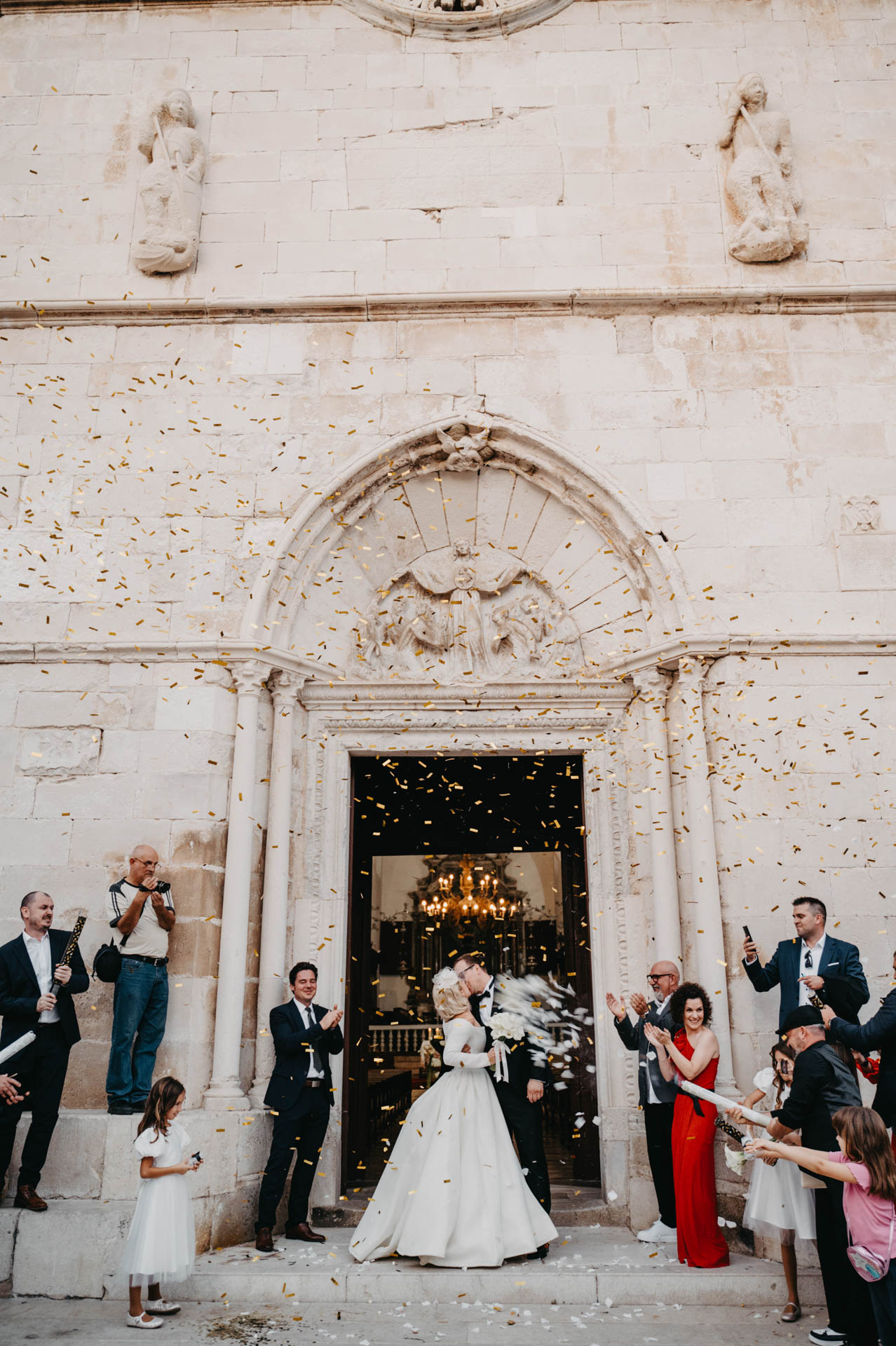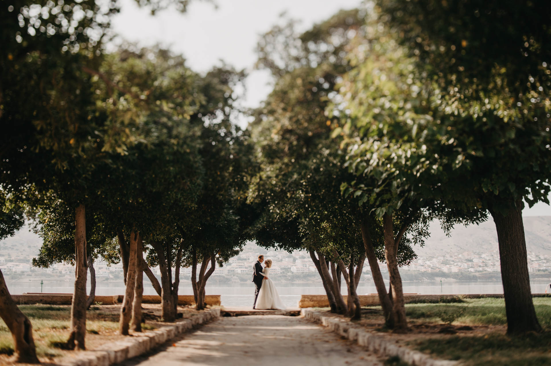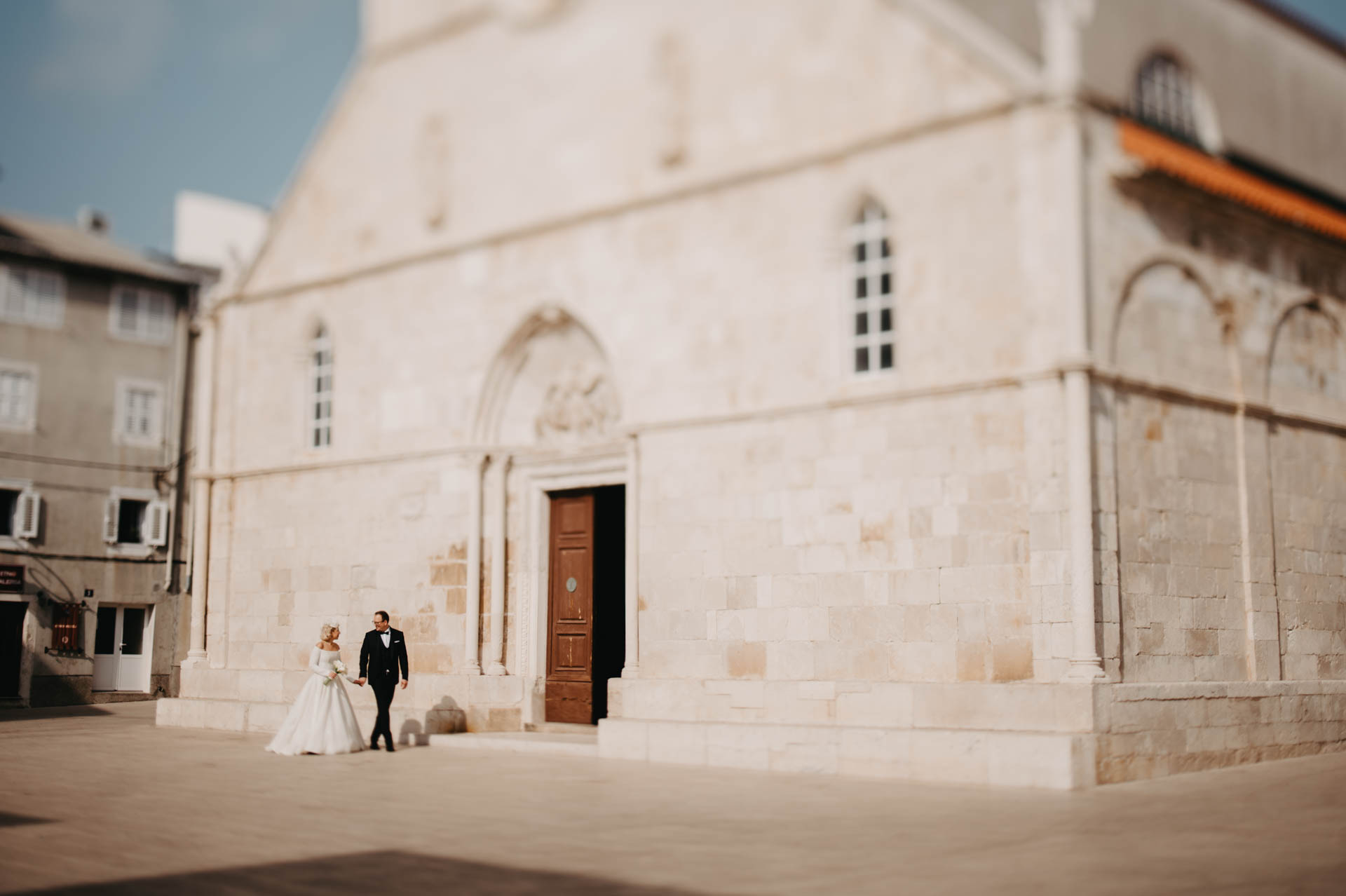 After the wedding at the stunning St. Stošija Cathedral in Pag, known for its Romanesque architecture and history dating back to the 4th and 5th centuries, we had a photo session around the town. Pag, located on the eastern part of the island, is famous for its salt, lace tradition, and unique stone architecture. Its narrow streets, historic buildings, and coastal views make it the perfect backdrop for romantic photographs.