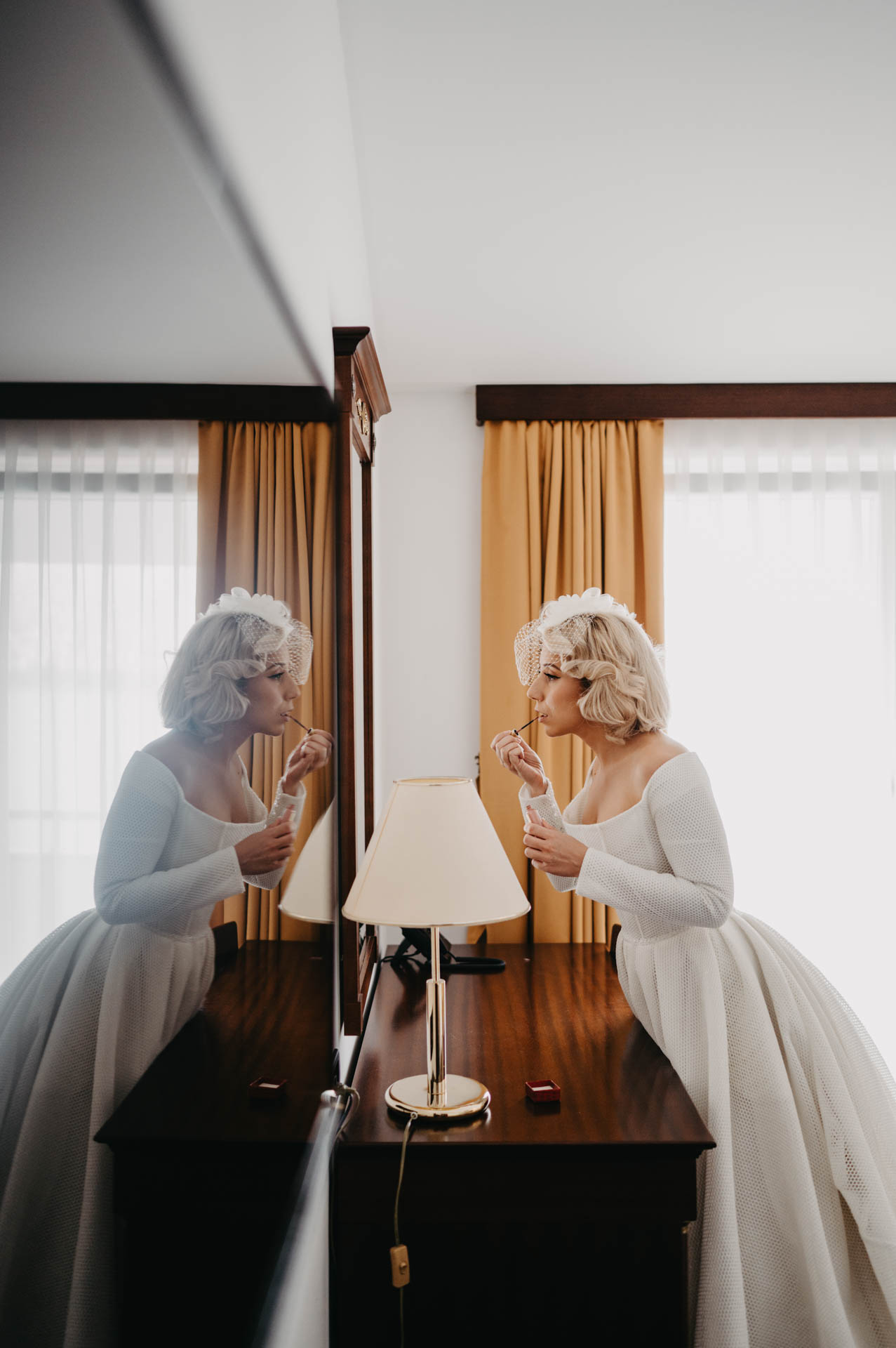 Preparations for the wedding started at the hotel with a boudoir photoshoot, where we discovered Katarina’s hidden talent. The groom was getting ready in the room next door, occasionally peeking to see how his bride was doing.
